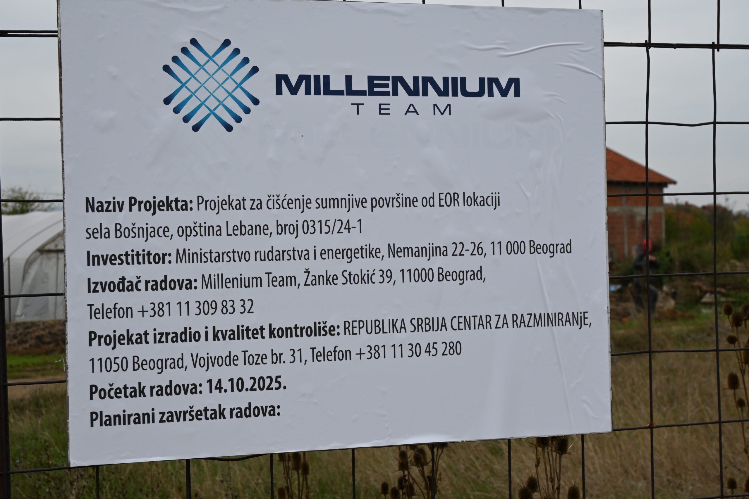 Представници Центра за разминирање извршили су проверу документације и опреме која ће бити коришћена, након чега је извођач радова „Мillennium Team“ ДОО, Београд, увeден у посао.