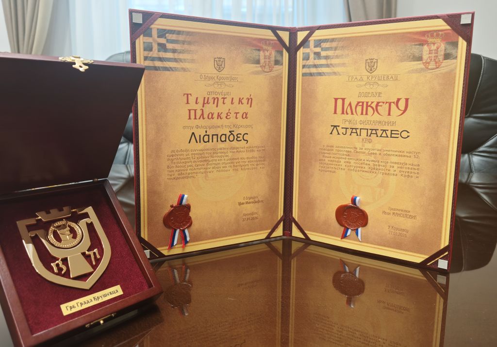 Град Крушевац је поводом 52 године постојања Крфској филхармонији „Љападес“ доделио Повељу за дугогодишњи уметнички рад и допринос повезивању народа кроз музику.